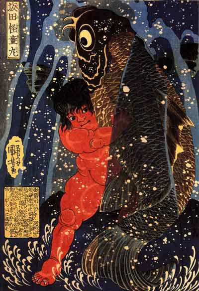 Finally another association pops up - that of Kintarô, a legendary child of superhuman strength said to have grown up in the mountains fighting with bears. In the illustration below, note the color red, the same as the color of devils (oni).